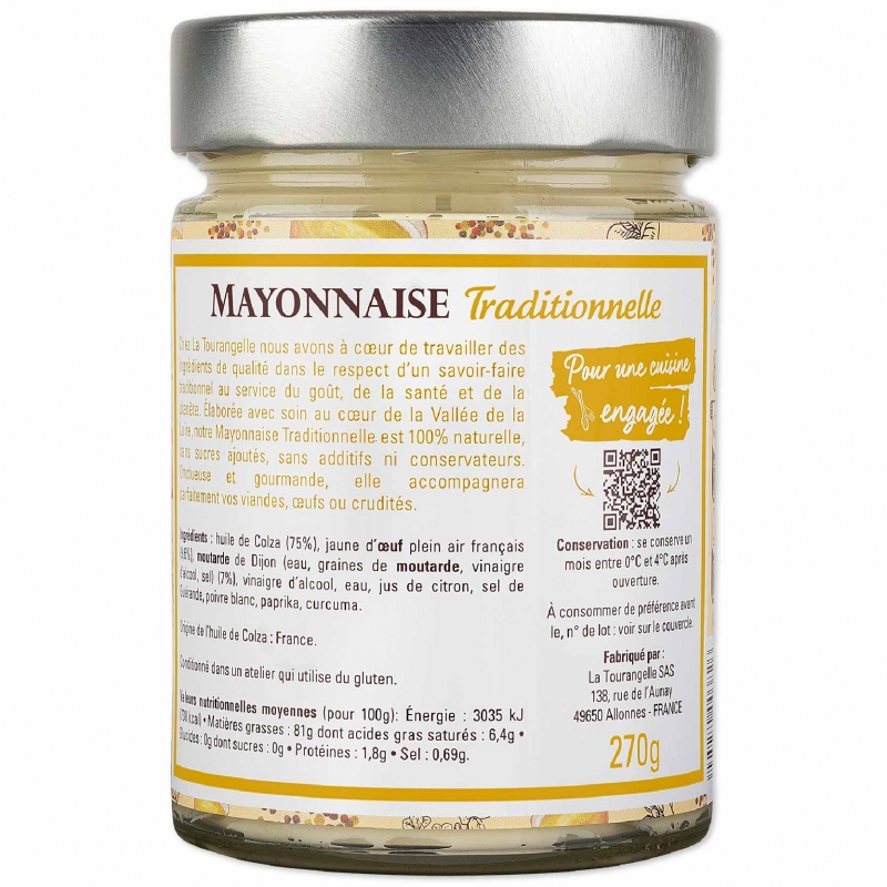 Ingredients: Rapeseed oil, French free range eggs, Dijon mustard (water, mustard seeds, alcohol vinegar, salt), alcohol vinegar, water, lemon juice, Guérande salt, white pepper, paprika, turmeric.