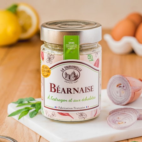 Ingrédients : Huile de Colza (71%), jaune d'oeuf plein air français, vin blanc de Saumur, vinaigre de vin rouge, échalotes (2%), sel de Guérande, estragon (0.95%), jus de citron, poivre blanc. Origine de l'huile de Colza, de l'estragon et des échalotes : France.