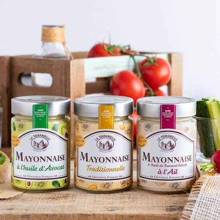 Ingrédients : Huile de Colza, Huile de Colza infusée à l'ail (Huile de Colza, Ail), Œufs plein air français, eau, vinaigre d'alcool, jus de citron, sel de Guérande, poivre blanc, paprika